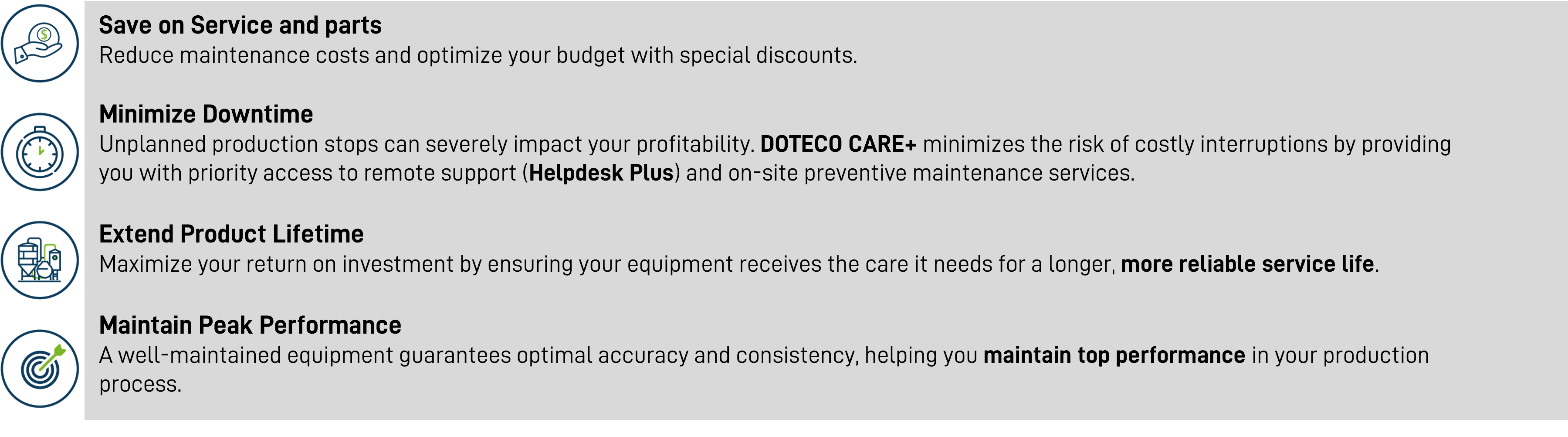 By subscribing to DOTECO CARE+, you gain access to multiple advantages such as: special deals on on-site maintenance, discounts on spare parts, and HELPDESK PLUS, our priority remote assistance service.